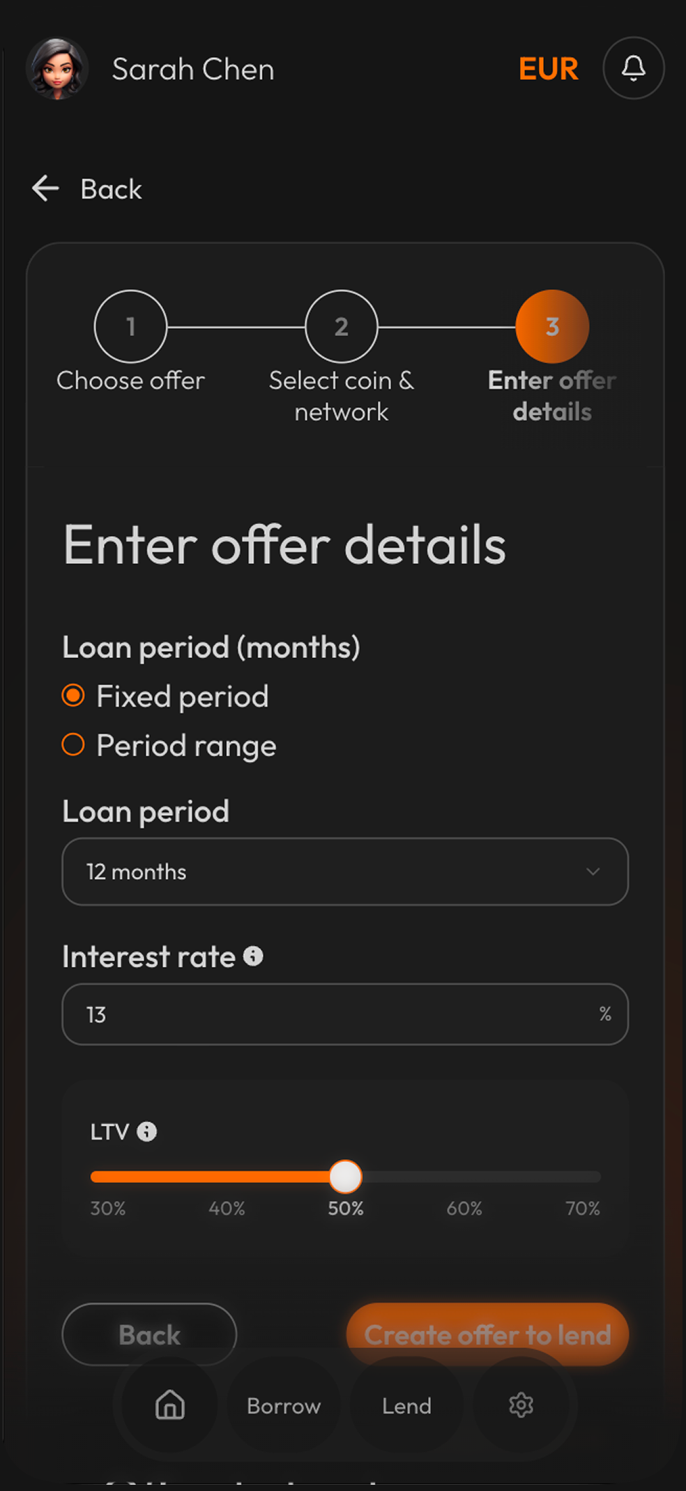 You set rates, duration, LTV, and loan size.Zero platform fees